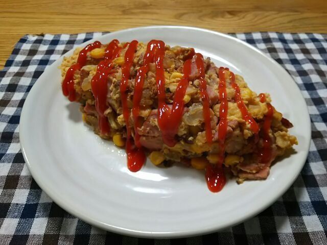 おとわれいさんのオムレツはとってもボリューム満点!卵3個に玉ねぎとコーン、きざんだハムをどっさり入れて作るそうです。簡単でおいしいがっつりメニューは、家族が笑顔になること間違いなし!おつまみにもしているそうですよ。