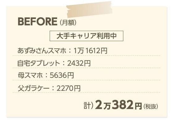 <BEFORE>家族3人分のスマホとネットで毎月約2万2000円の出費