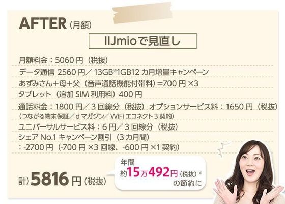 なんと、IIJmio「みおふぉん」に乗り換えた場合の年間の通信費総額のシミュレーション結果が大手キャリアの約24万4500円に対し、IIJmio「みおふぉん」なら約9万4000円となり、年間で約15万500円の節約になることが判明!(※2) びっくりしすぎて「これなら家族旅行ができちゃう!」とその場で言ってしまいました(笑)。