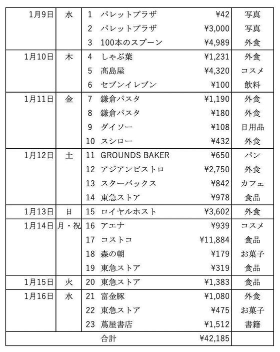 B:休日の外食で1番高かったのは、日曜日に行ったロイヤルホスト、3,602円でした。せめて1枚でも減らせたら大きいので、夫と外食の考え方を話し合ってみます!