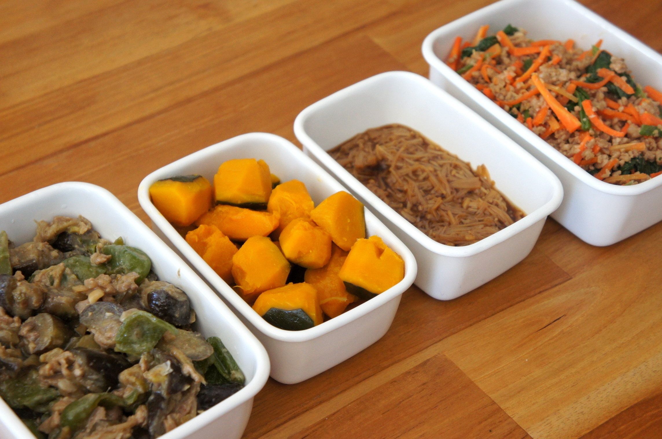 ユッカさんがつくった常備菜は、なめたけ、カボチャの煮物、ほうれん草のひき肉和え、豚ナスピーマンのみそ炒めでした。なめたけはご飯にかけて、ひき肉とみそ炒めはお弁当のおかずに使うのがおすすめなのだといいます。いそがしい平日のお弁当づくりや夕飯づくりも、常備菜があれば、時間に追われないのだとか。