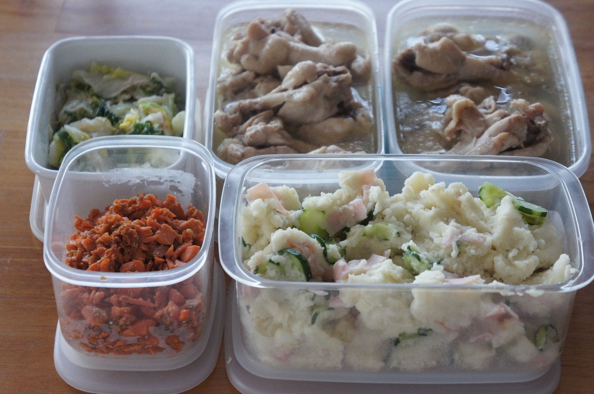 ほかにもユッカさんはポテトサラダ、白菜のサラダ、手羽先元のスープ煮、鮭フレークを。鮭フレークは家族からも好評で、気軽につくれて食べられる魚料理としてよくつくるそうです。手羽先は後日フライドチキンにしたようですが、これも家族から大好評だったとのこと。