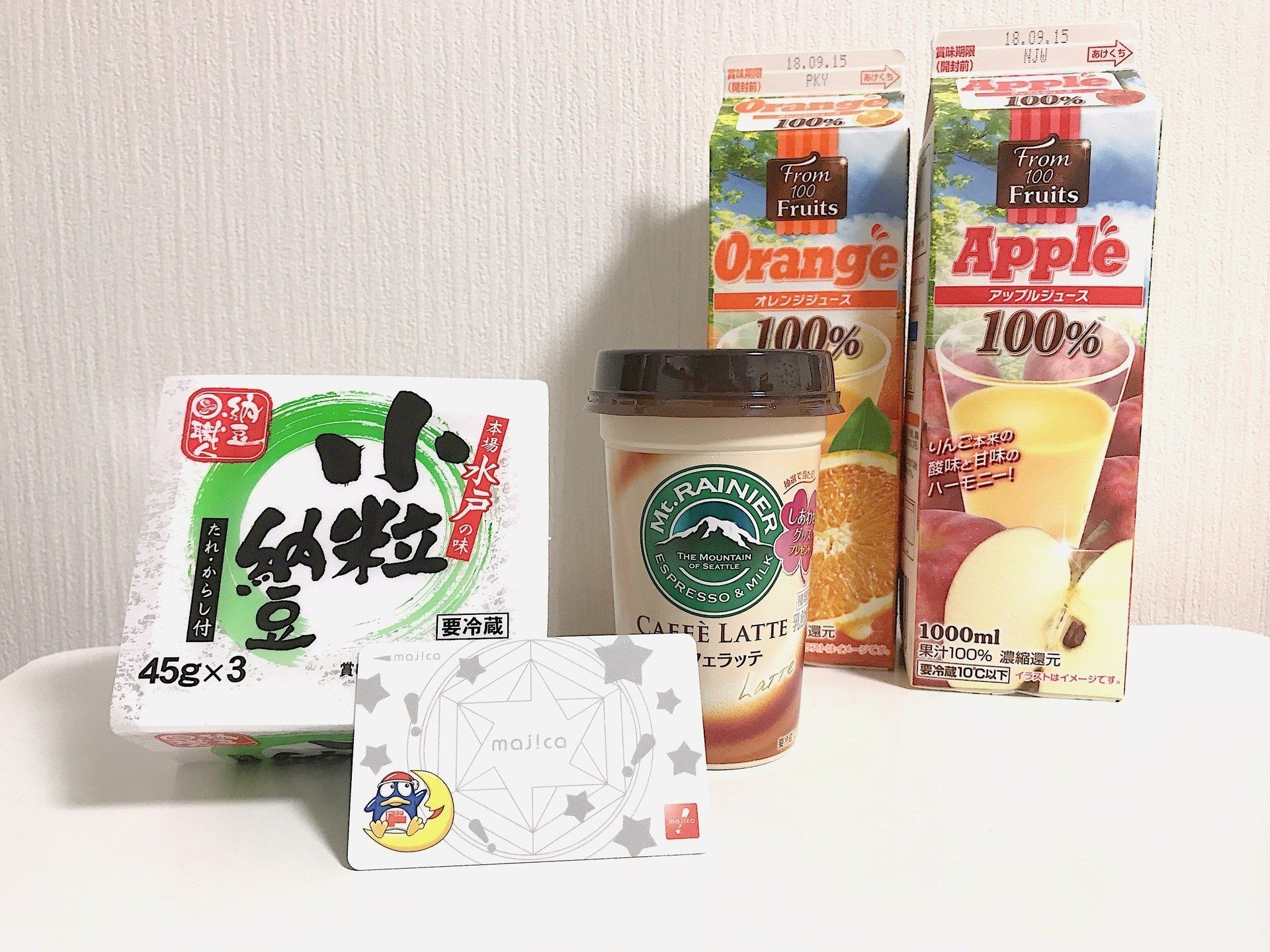 海老原葉月さんがドンキで買い物をする際に活用しているのが、電子マネー機能つきのmajicaカード。会員になると、お得なクーポン価格で商品を購入できます。写真の納豆は10円、カフェラテは50円、ジュースは1本50円でゲット。よく行くMEGAドンキは生鮮食品も安く、ちょっと根の張る西洋野菜がお手頃価格で手に入るそうです。