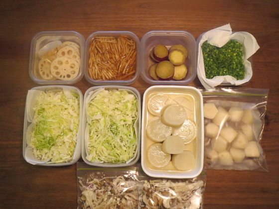 そんな野口ゆかさんは、食材の保存方法にもひと工夫加えています。予算1,000~2,000円でまとめ買いした野菜類は、レンコンやゴボウは酢水に漬ける、サツマイモは砂糖水で煮る、サトイモは軽くゆでて急速冷凍など、献立を考えながら下処理して保存。下ごしらえ済みの野菜があれば、食材をムダなく使い切れて、料理の時短にもなりますよ。
