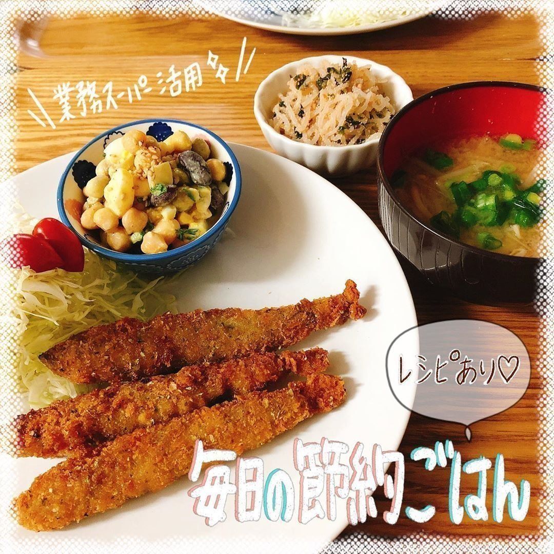 mayu.kakei_28さんは業務スーパーの商品を活用して食費を節約しています。お米や調味料、外食などを含んだ予算を3万円に設定し、朝のうちに夕食の下準備を終えておくことで外食やコスパの悪い食材の購入を防止。この日は、業務スーパーの冷凍食品を使って、ミックスビーンズサラダやししゃもフライをパパッとつくりました。