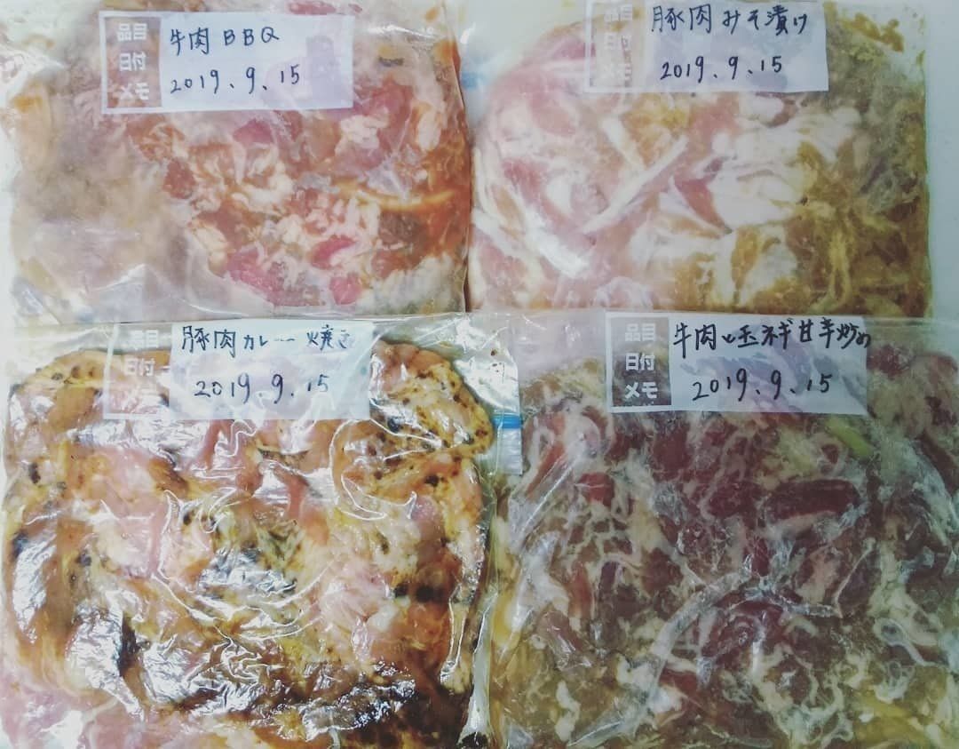 asumin931さんの食費節約テクは、お肉をタレにつけて冷凍保存する下味冷凍。この日は、牛肉BBQ味、豚肉カレー焼き、豚肉みそ漬け、牛肉と玉ねぎの甘辛炒めと、4種類の下味冷凍をつくりました。コツコツと下味冷凍や作り置きをすることで、平日はなるべく外食やお惣菜に頼らずに生活できているようです。