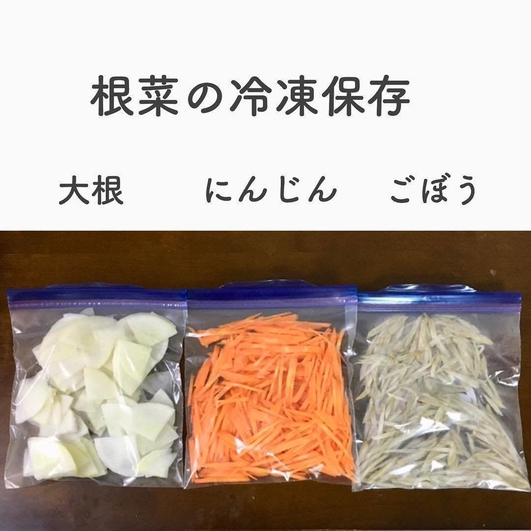 だいこんやにんじん、ごぼうなどの根菜野菜は冷凍して保存しています。だいこんの皮を剥いたら、用途別に分けてカットして保存袋で冷凍。にんじんも同様に保存し、つかうときには冷凍のまま調理します。ごぼうはカットしたあとに水から沸騰するまでゆでて、水気をなくしてから冷凍保存しているのだとか。