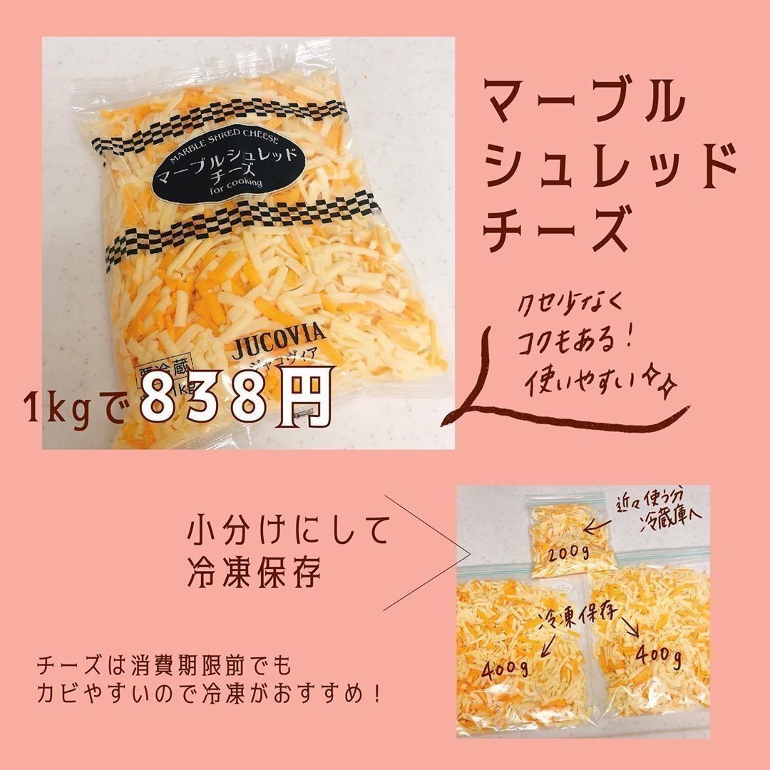 大袋入りのチーズは、すぐに使うものと冷凍保存用に分けて保管しているmayu.kakei_28さん。チーズは消費期限の前でもカビることが多いので、冷凍しておくことがよいのだそう。また、オイコスのヨーグルトも近所のスーパーより低価格で販売されているので、購入しました。