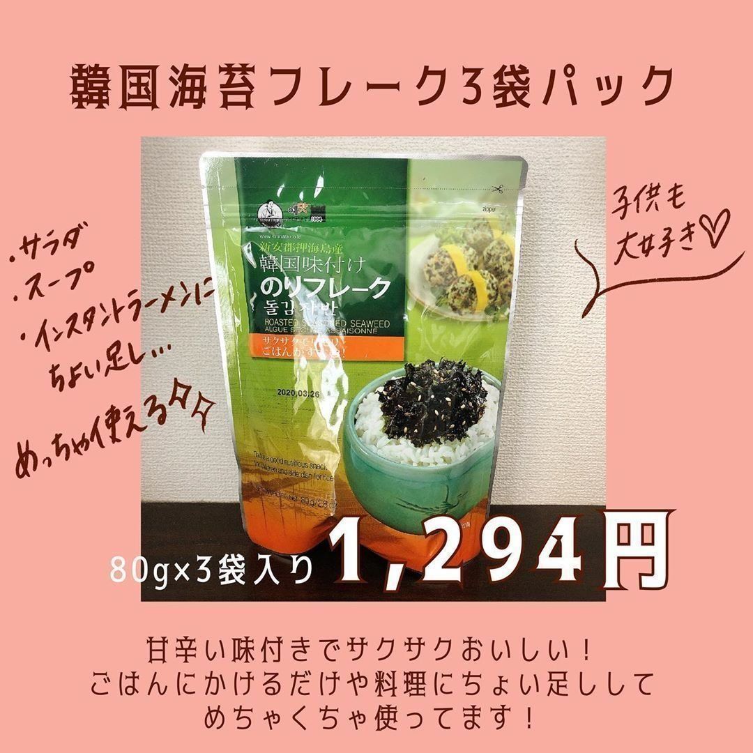 mayu.kakei_28さんは、サラダやスープ、インスタントラーメンのちょい足し具材に活用できる韓国海苔フレークも購入しました。甘辛い味付けで料理のアレンジにも使用できるので、よく使っているのだとか。ご飯にかけるだけでもおいしいそうですよ。