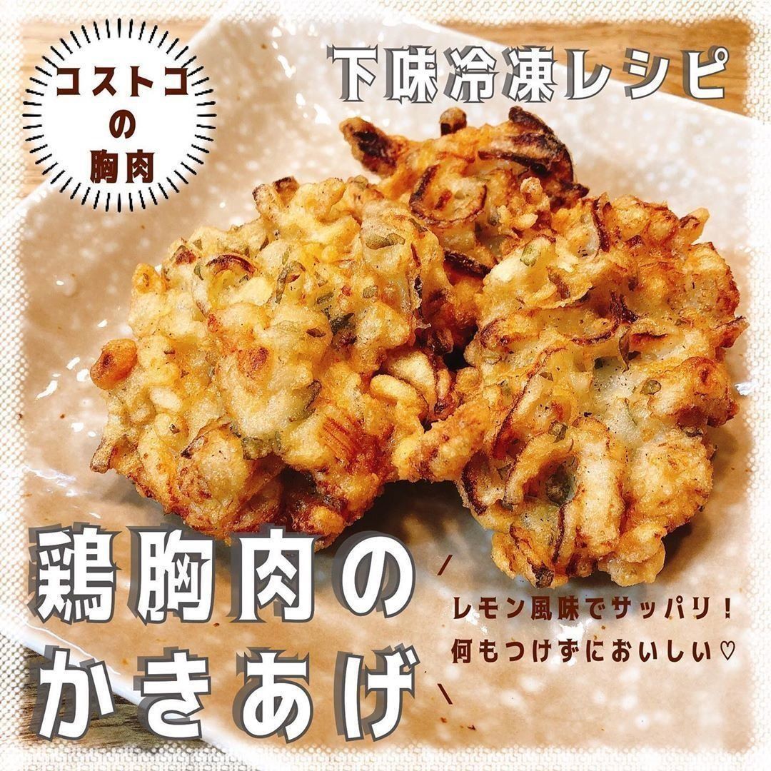 コストコのさくらどりむね肉を活用するmayu.kakei_28さん。胸肉をそぎ切りにして、さらに細切りにします。玉ねぎと大葉、酒、レモン汁、塩、マヨネーズを保存袋に入れてよくもんでなじませたら冷凍保存。調理するときには、薄力粉と片栗粉、水をダマにならないように混ぜたら油で揚げるだけの簡単レシピです。
