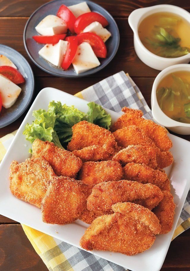 1.鶏肉は厚さ1.5㎝のそぎ切りにし、包丁の背で全体をたたく。塩、こしょうをふって、薄力粉を薄くまぶし、溶き卵、パン粉の順にころもをつける。