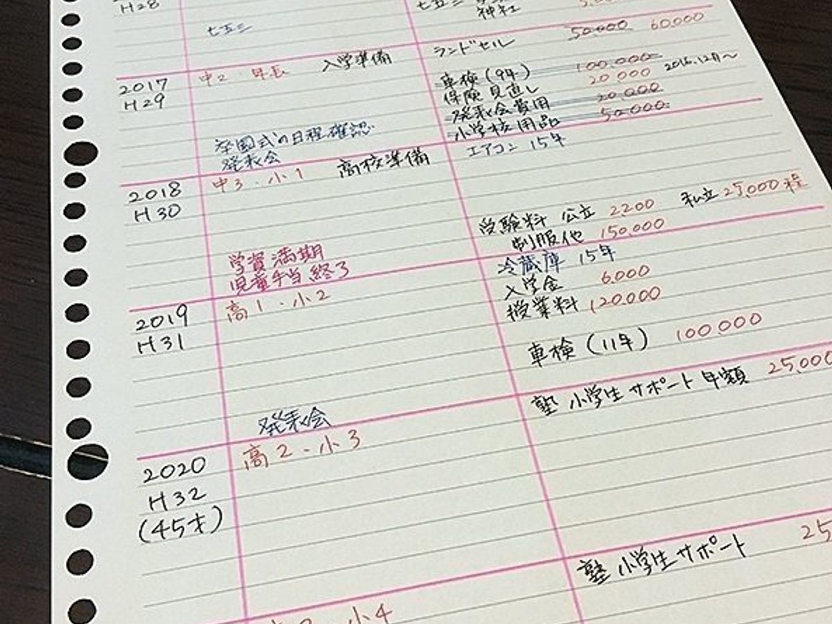 夫が転職し、年収ベースでは上がったものの、月収ベースでは収入減。子どもも増え、月1万円貯蓄するのがやっとの状態。上の子の中学入学準備と下の子の幼稚園代が重なった30代後半は、家計のドン底を実感。「ライフプラン表で下の子が小学生になれば少しラクになるとわかっていたから、なんとか頑張れました」。