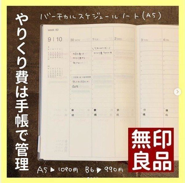 日々のやりくりを家計簿に細かく残すのはとっても面倒ですが、手帳で管理することで家計簿よりもハードルを下げられます。無印のバーチカルスケジュールノートなら、メモスペースも多いのでより簡単に日々のやりくりをメモできます。