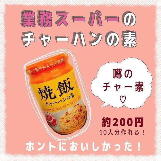 mayu.kakei_28さんは、メディアで話題の瓶詰めタイプのチャーハンの素を購入。瓶詰めタイプは、粉末と比べて肉感が多く、ほかに具材を入れなくてもおいしく炒飯がつくれるのだそう。熱したフライパンに卵と温かいご飯、チャーハンの素を入れたら完成。業務スーパーの冷凍青ネギも追加してもいいですね。