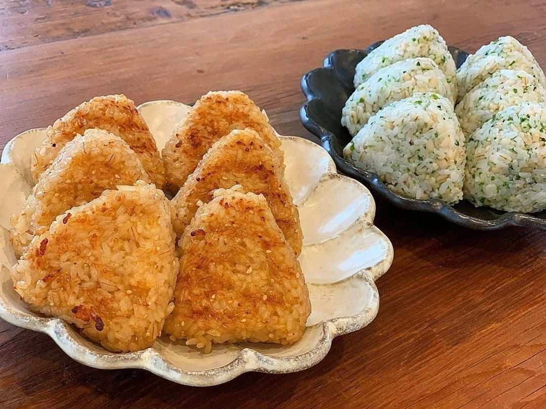 冷凍食品のストックに焼きおにぎりとのり塩おにぎりをつくっているnaochiintoさん。ランチとしておにぎりだけで持っていく日もあれば、おかずを詰めてお弁当にする日も。外食や中食を防ぐ工夫をしています。