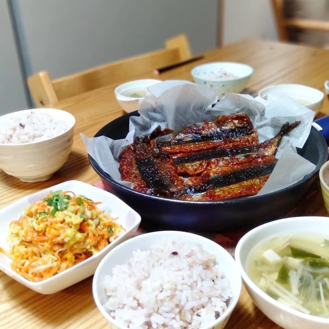 itsumi.nakashimaさんは、子どもも大好きなさんまの蒲焼きをメインに、592円で夕食を完成させました。副菜の人参とエノキの卵とじや、わかめや豆腐、白菜など具だくさんのすまし汁で彩りもばっちり。高値のさんまをいれても、500円台なのがおどろきです。