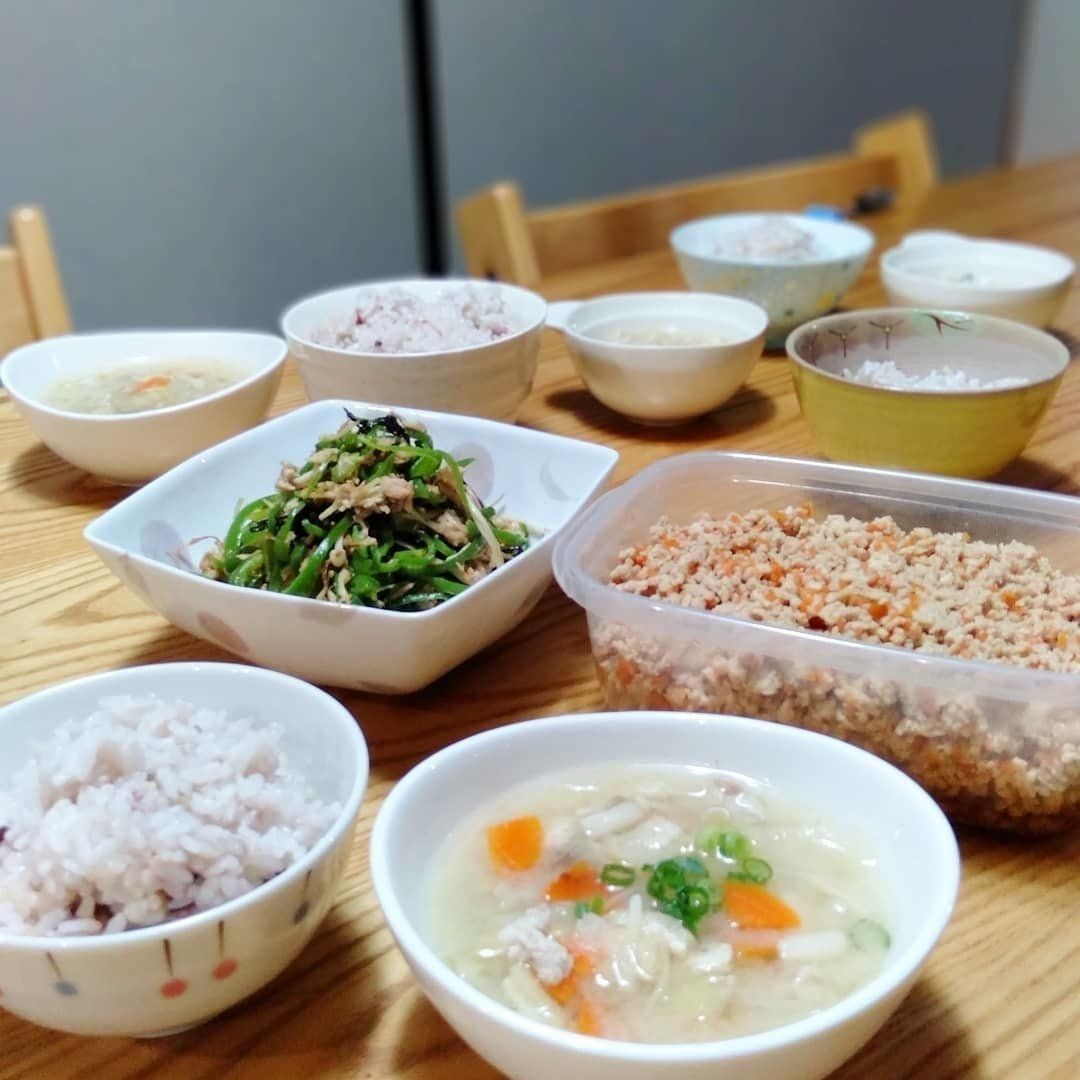 itsumi.nakashimaさん宅の夕食は、鶏そぼろがメインで646円。エノキと塩昆布を加えた無限ピーマンと、残っていた野菜でつくった豚汁で彩りもボリュームもばっちり。鶏そぼろにみじん切りにした人参を入れることで、かさ増し&ヘルシーになります。あまった分は翌日のお弁当のおかずに回してもOK。
