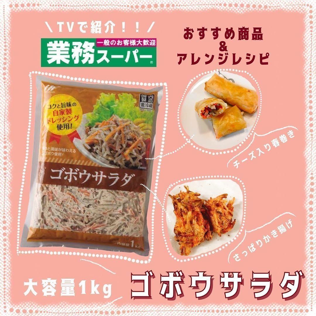 業務スーパーの冷蔵コーナーに売っている1kgのゴボウサラダ。そのまま食べるだけでなく、春巻きにしたり、かき揚げにしたりとアレンジもできるそうです。あと1品欲しいときに重宝しそう!