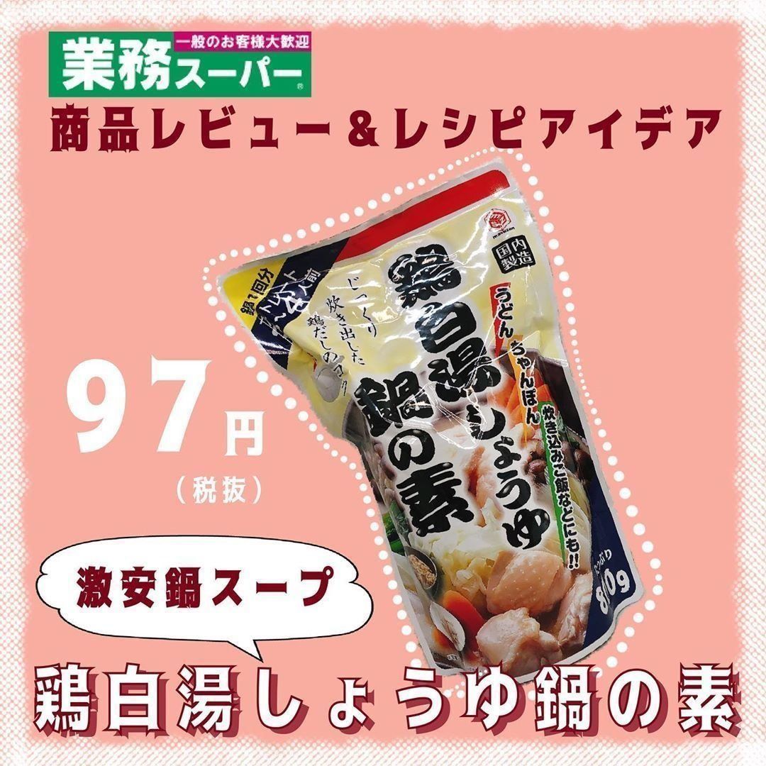 業務スーパーの食材を使ったアイデアレシピが人気のmayu.kakei_28さんは節約上手!今回業務スーパーで購入したのはおどろきの安さの鍋スープです。なんと97円にも関わらず国内製造で味もおいしいのだとか。鶏白湯しょうゆ味の〆はラーメンがオススメだそうです。