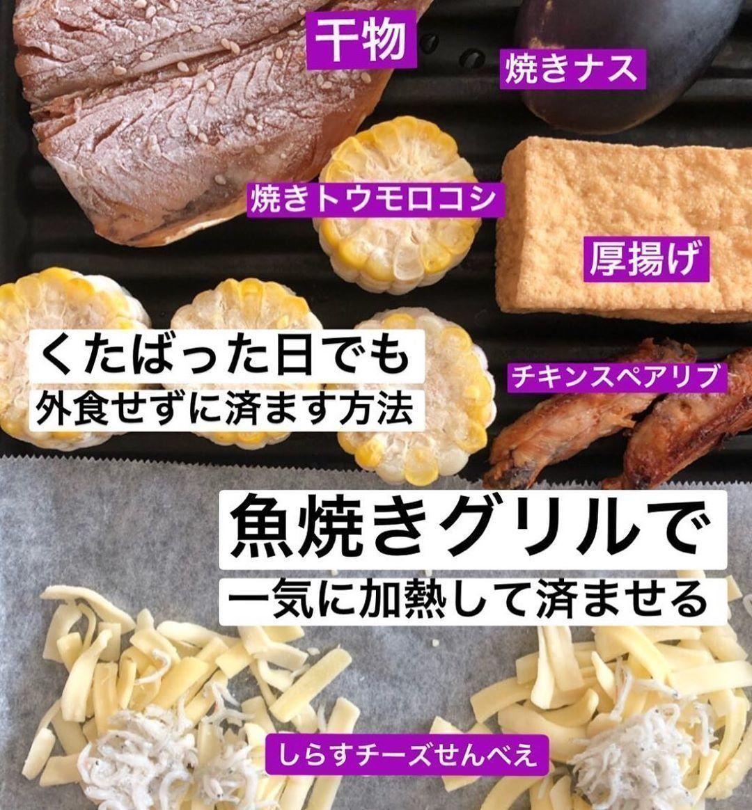 食費節約と健康維持のため、外食や中食を控えているjapanese_kitchenさん。1日動き回って疲れた日のメニューは、魚焼きグリルで一気に仕上げます。下処理して冷凍保存してある食材を、全部魚焼きグリルに並べて加熱するだけ。栄養バランスも◎。簡単にすませられてうれしいですね!