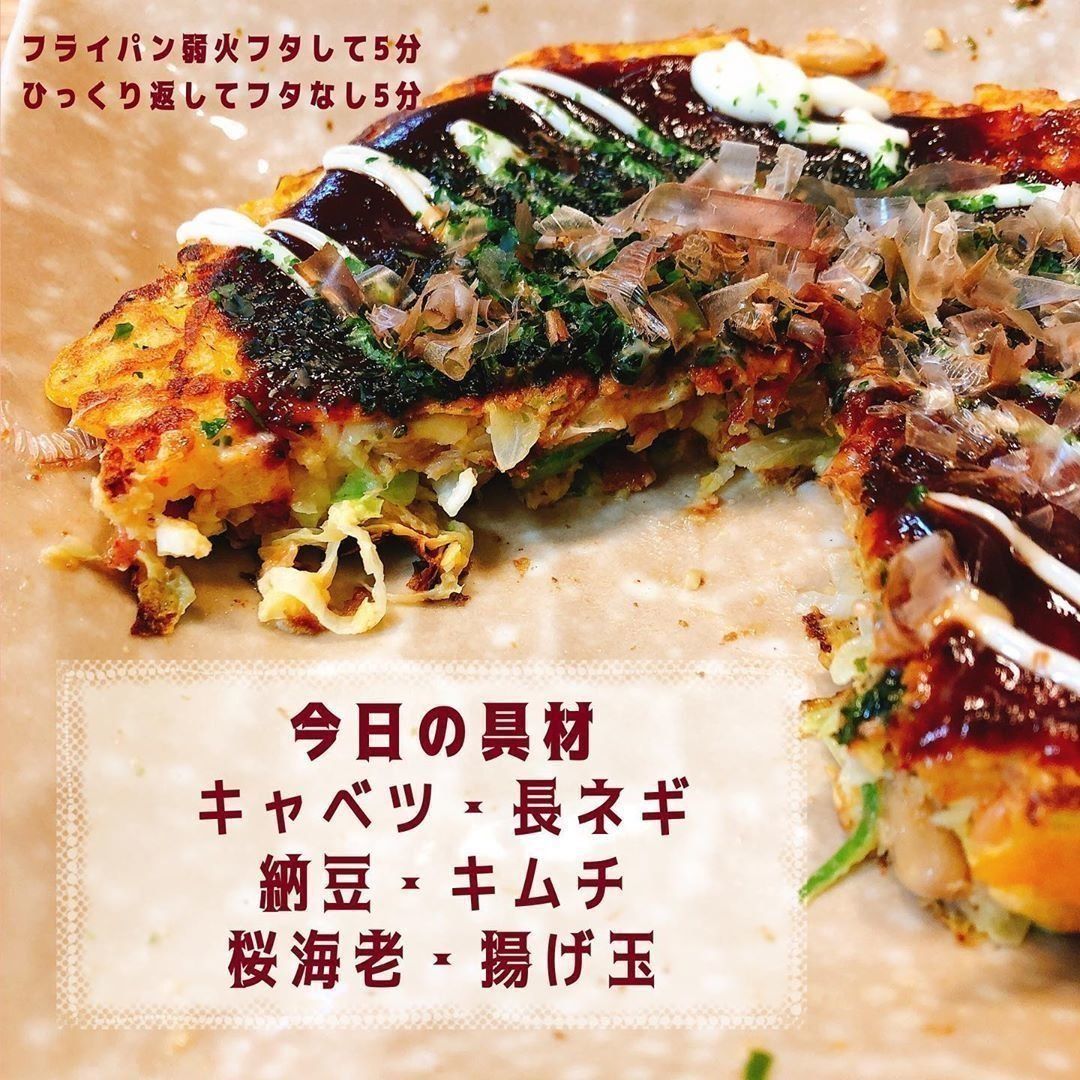 mayu.kakei_28さんオススメの食費節約レシピは、冷蔵庫の余りものでできちゃう簡単お好み焼きです。薄力粉、片栗粉、卵、だしの素、水でつくるお好み焼きベースに好きな具材を混ぜて焼くだけ!ソースとマヨネーズの魔法で、子どもたちにも大人気のメニューになるのだとか。