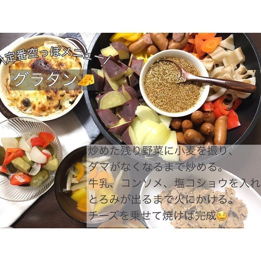 月末の冷蔵庫内のリセットを習慣化しているhazuki39homeさん家。翌月分の食材を購入する前に中身をスッキリさせることで、食品ロス防止、調味料の残量確認とともに庫内の掃除までできちゃいます。オススメの冷蔵庫空っぽメニューは、素を使わないでつくるグラタンとフライパンでつくる蒸し野菜だそうです。