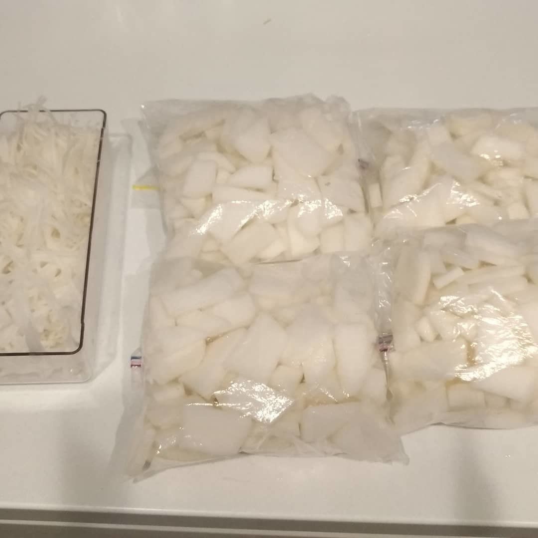 お手頃価格になった旬の食材をまるごと使い切ることで食費を節約しているh_rio39kurashiさん。大根をまるごと1本購入したらピーラーで皮をむき、4等分に切ってから外側はスライサーで千切りにしてその日のうちに味噌汁の具やおかずの一品に。残りはイチョウ切りにして冷凍保存します。