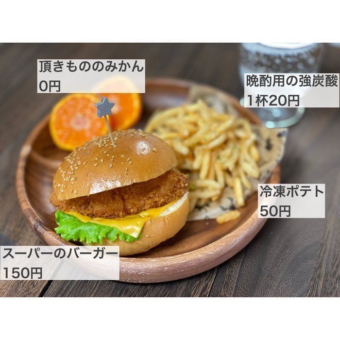 食費を抑える際に見直したいのが「外食費」。海老原葉月さんは、外食で食べるものを自宅で再現する「おうち外食」で食費を抑えているんだそう。この日つくったのがファストフードの再現メニュー。スーパーで買った材料やいただきものを使い、1人あたり220円でつくったんだとか。用意する手間はかかりますが、外食なしでも楽しくなりそうですね。