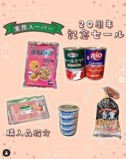 こちらは業務スーパー20周年記念セールでのお買い物です。豚肉生姜焼きや缶トマト、ベーコン、ツナ、ウィンナーなど、どれも家にあると便利な食材です。普段から安い業務スーパーですが、このようなセールを利用すれば、さらに安く購入することができます。ぜひお店の情報もチェックしてみてくださいね。