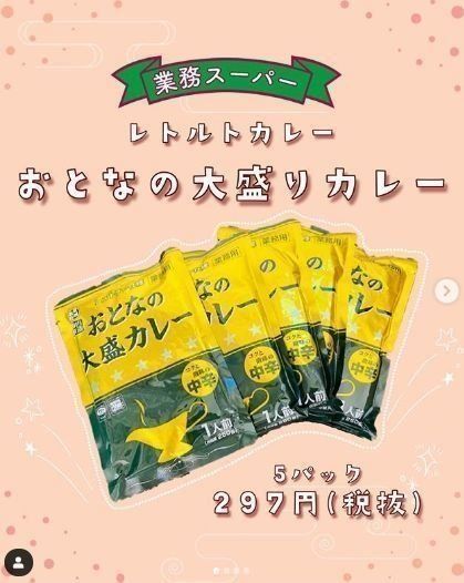 業務スーパーはレトルト食品もお買い得品が多くなっています。こちらの大盛カレーは5パックで297円。1食60円もしません。甘口、中辛、辛口と種類もあるので、いくつかストックしておくといざという時に便利です。業務スーパーの冷凍野菜も使って、具だくさんのカレーにするのも良いですね!