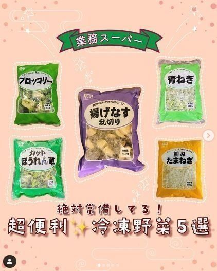 業務スーパーにはたくさんの冷凍野菜があります。ブロッコリーやホウレンソウ、青ネギ、玉ねぎ、揚げなすなど、それぞれ使いやすい大きさにカットされているので、袋から取り出してポンポンお鍋やフライパンに入れるだけで、お野菜たっぷりのおかずを作ることができます。青ネギや玉ねぎは細かくカットされているので、そのままあらゆる料理に使えます。