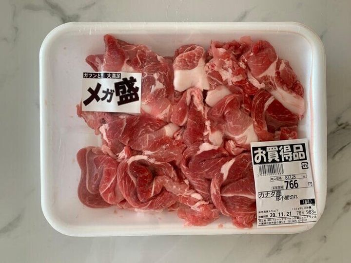 サンキュ!STYLEライターsaoriさんがオススメするのは、カナダ産豚こま肉。100gあたり税別78円と格安で、お肉も分厚いのだとか。これを浄水で洗い水気を取ってから、小わけにして冷凍しているといいます。業務スーパーの安いお肉をまとめ買いしておくだけで、楽に節約できるようです。
