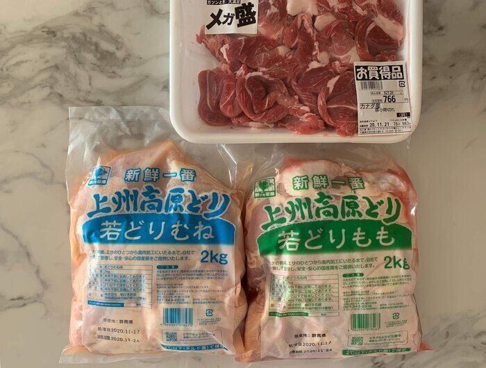 肉好きなsaoriさん宅では、業務スーパーの大容量お肉を毎月まとめ買いしているそうです。国産の鶏胸肉は2kgも入って950円、同じく国産の鶏もも肉は2kgで1,620円と、ほかのスーパーよりも格安で購入できます。いろいろな料理にアレンジできるよう、下味冷凍しておくとおすすめなのだとか。