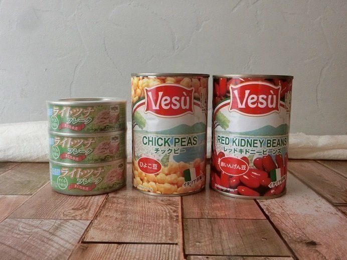 10年以上業務スーパーに通うわんたるさんのおすすめが、ツナ缶やビーンズ缶といった缶づめ商品。サラダやスープ、カレーなどに入れてもおいしく、肉の代わりのかさ増し食材としても使える万能食材なのだそう。賞味期限が長く手にとりやすい価格なので、よくストックしているといいます。