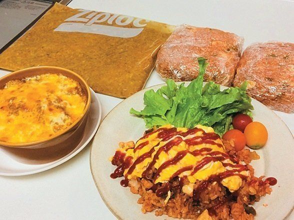 カレーなどは2回分作って半分を冷凍。帰りが遅い日や「明日は仕事が休みだ~」と気が抜ける金曜日はこれで乗り切って、外食は月2回に。カレーはチーズをのせてドリア風、ケチャップライスは家族分の卵をいちどに炒めてON。(『サンキュ!』読者 森本美沙さん〈仮名〉)