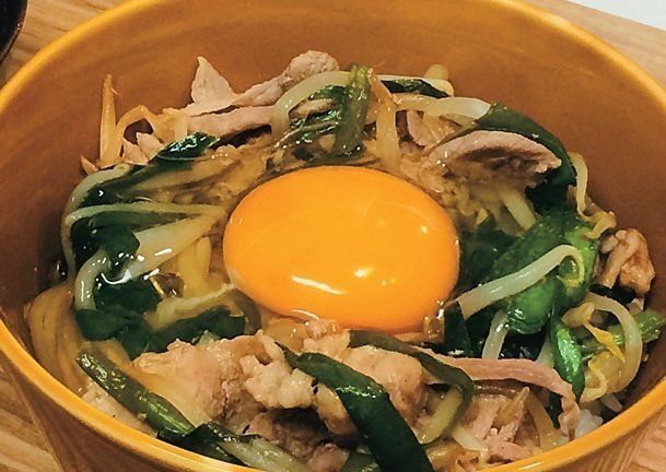 冷蔵庫にいつもあるもやし、にら、豚こまを、焼き肉のたれでチャチャッと炒めてどんぶりに。生卵をのせるとプチ豪華。ラクに作れるどんぶりバリエでうっかり外食を回避しています!(森本美沙さん〈仮名〉)