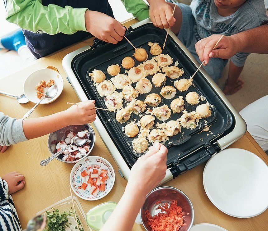 ホットプレートでたこ焼き、お好み焼きなどを作って〝うちパ”を満喫。パパが率先して準備してくれるので、ママは家事を休めるし、外食よりも節約できてWでお得!