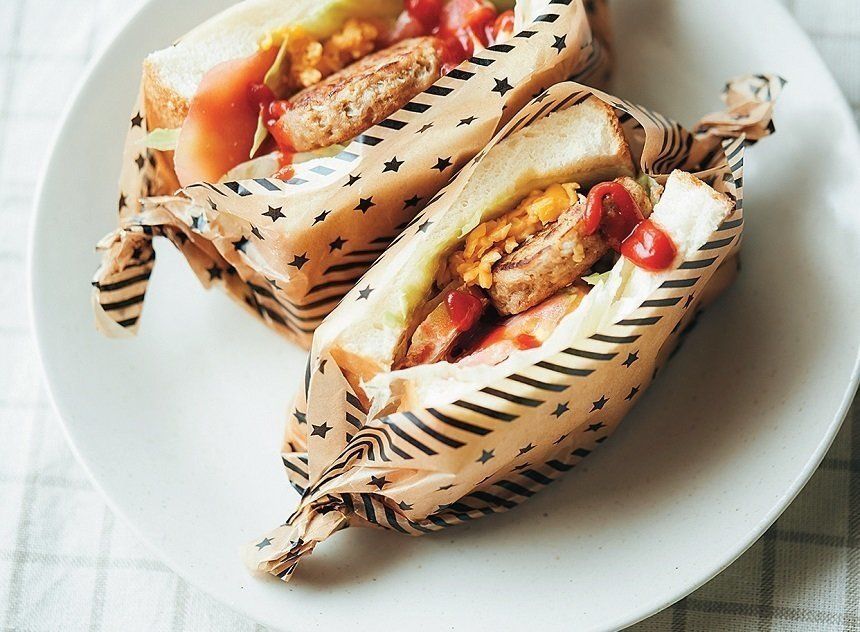 いつもある食パンにハンバーグ(作り置きして冷凍保存)、レタス、トマト、スライスチーズなどをはさむだけ。「ラッピングなどで工夫すれば、子どもたちも充分満足!外食の5分の1程度の出費ですみます」