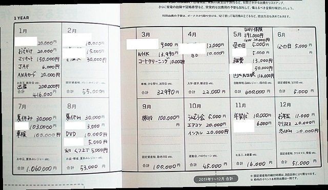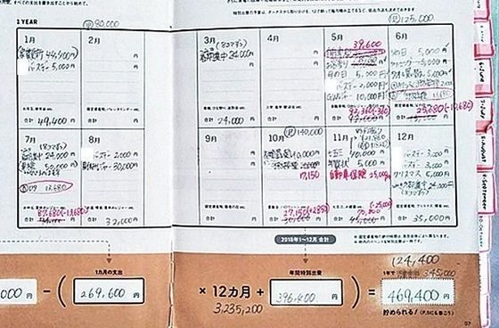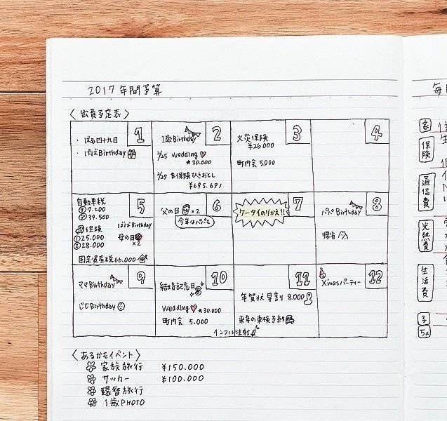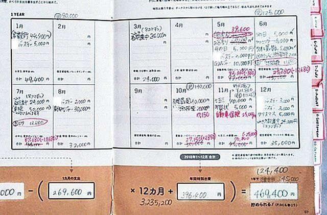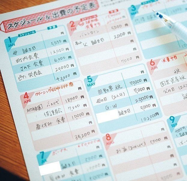年末に翌年の特別出費予定を手帳に記入し、その分の予算を毎月積み立て。貯蓄に手をつけることがなくなりました。少し多めに予算立てして、その年実際にいくらかかったのかを赤ペンで修正しておき、翌年の予算の参考に。プレゼントなどはお得に買うプランもメモして、計画的にお金を使っています。(サンキュ!トップブロガー Nagomyさん)
