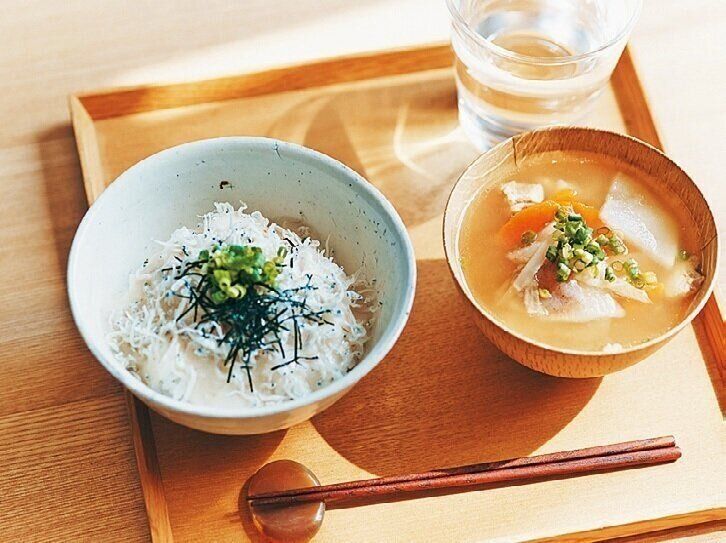 「しらす、とろろさえあれば、各自がご飯にのせて食べてくれます」。前日の夕食で作った具だくさんみそ汁を添えたら、バランスもバッチリ。