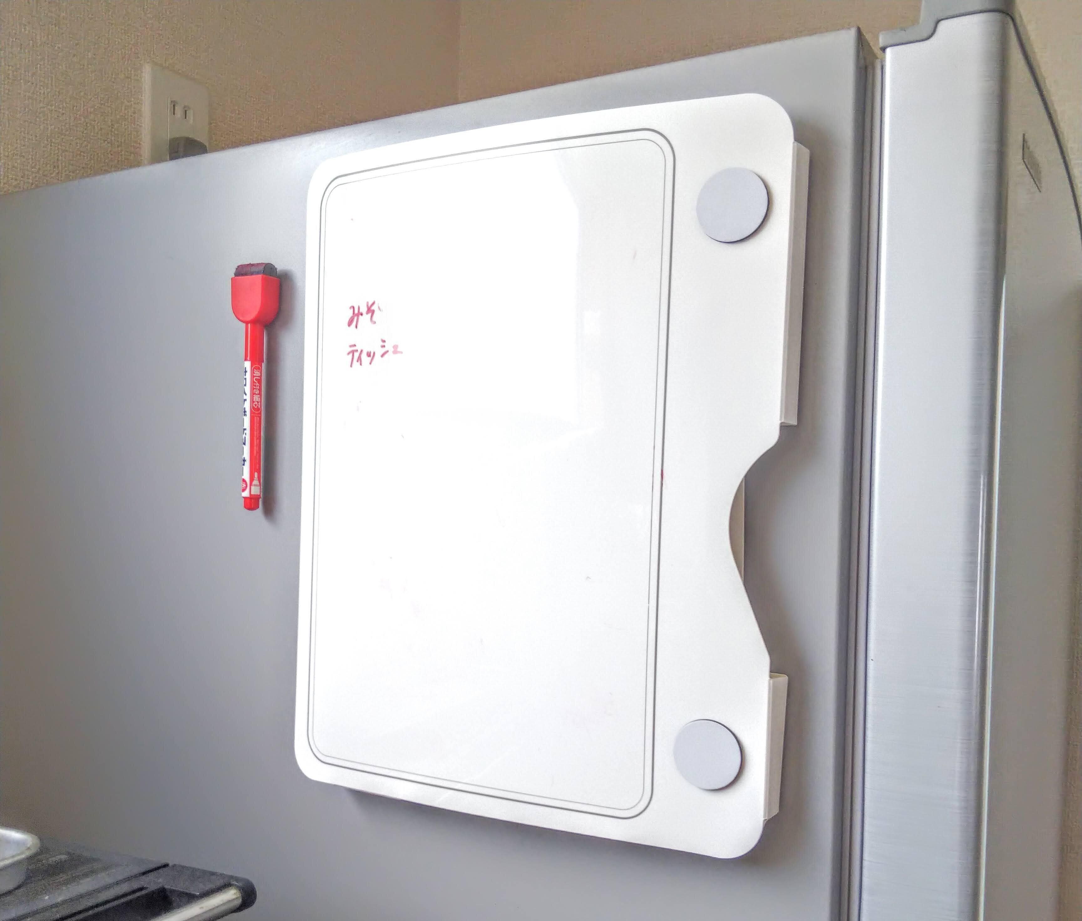 ふたつめの方法は、ストック品の買い方。調味料や日用品のストックが切れたら、必ずメモをして、買い物の前にさっと確認できるようにしました。やり方は、冷蔵庫横にホワイトボードを設置して、夫婦で協力体制をとり、写真を撮ってから買い物にいくだけ。