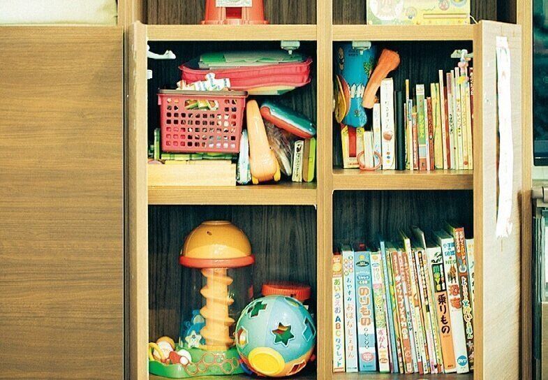 スッキリした部屋で仕事帰りの夫を迎えたいから、子どもが寝たら一気に片づけ。「おもちゃの量が多いと片づけ時間も増えるから、備えつけの収納に入るだけと決めています。結果的に、おもちゃの購入費もセーブできて◎」。