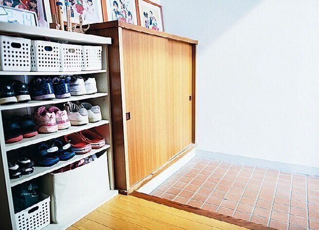 子ども1人につき3段カラボ1つが収納場所。「鞄は学校のロッカー風に、靴は下駄箱風に置く場所を指定。低学年でも片づけられるので、私の負担も減ります」。