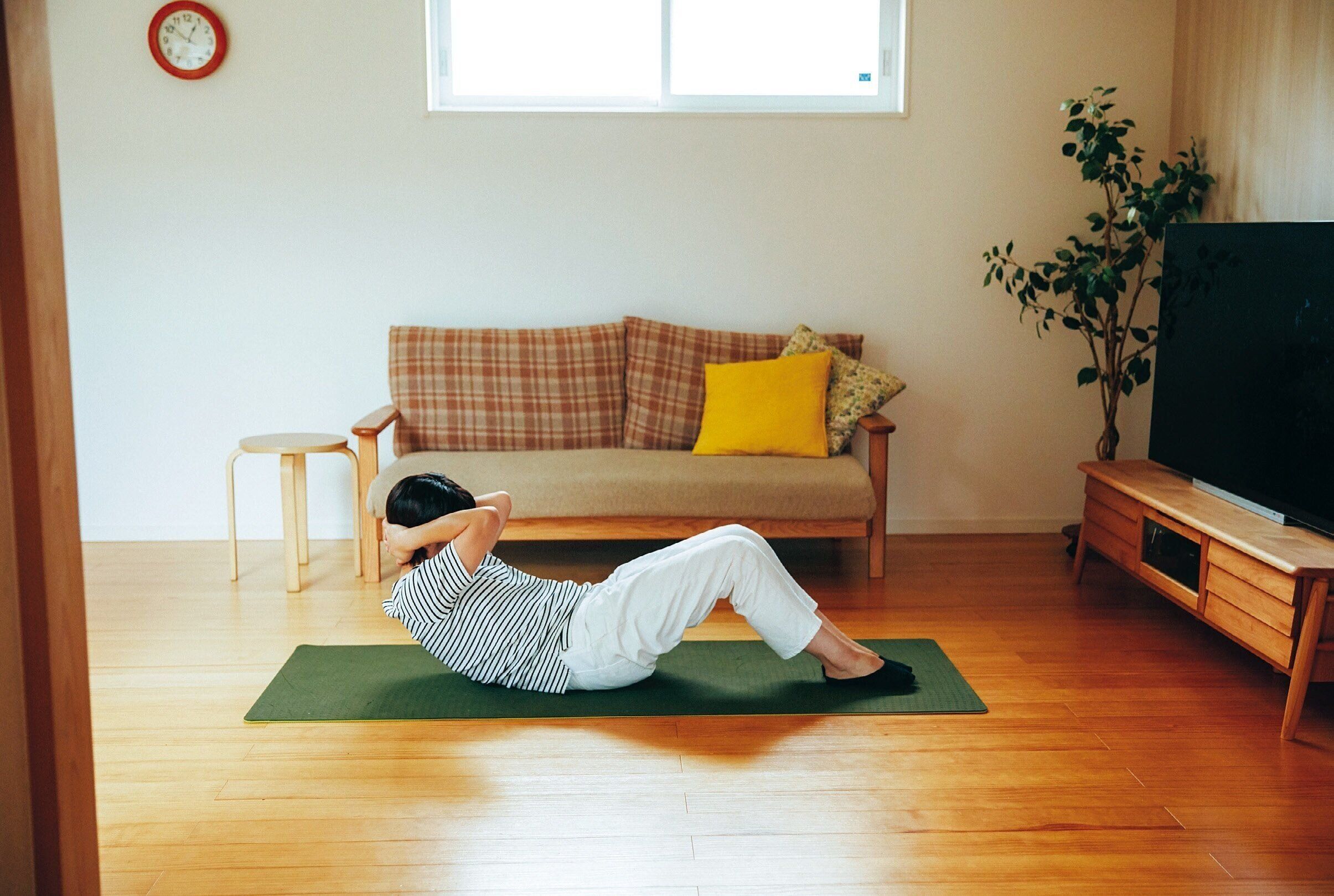 思い立ったらすぐ腹筋やストレッチができるよう、リビングにはヨガマットを出しっ放し。すき間時間にちょこちょこ運動することで、タダで健康維持& 病気知らずで医療費激減。