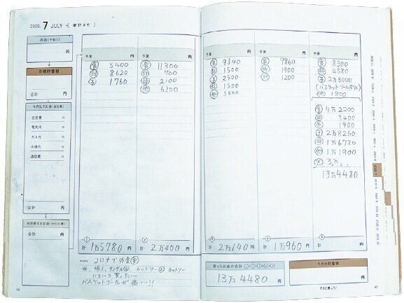 家計メモ欄には1週間ごとの支出を費目ごとに記入し、毎週集計しています。出費の多かった費目については具体的にどんな物に使ったか下欄にメモして、ムダ買いなのか必要経費なのかをきちんと把握。