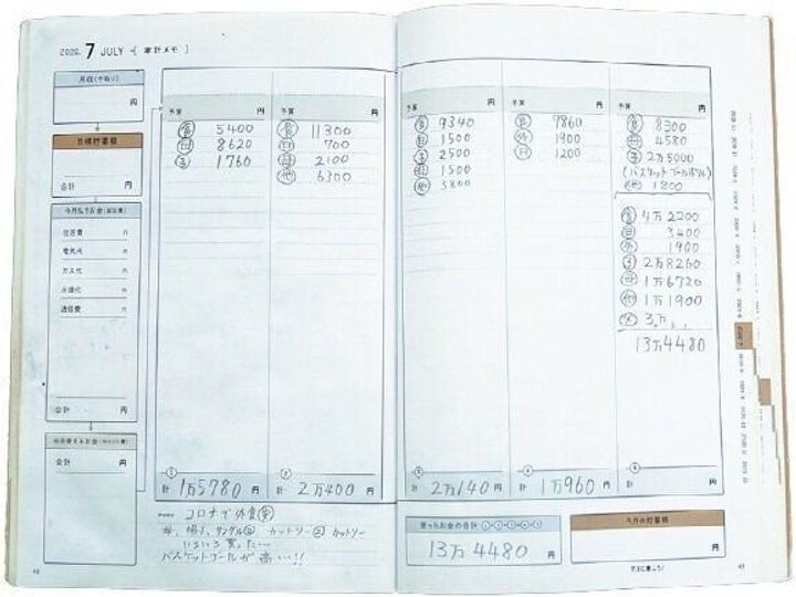 買い物時のレシートは、とりあえず家計ノートにはさんでおき、日曜日、まとめ買いから戻ったら月~日曜の費目ごとの支出額を合計して記入。合計額だけ書けばいいのでラクチンです。