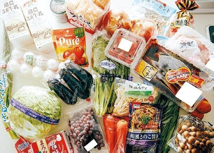 「日曜に約7000円分をまとめ買い。毎回、野菜10種と果物1種、肉と魚で4パック、食パン、おやつ2種、卵、牛乳2本とツナ缶、納豆が定番。特別な物は買わないので、出費は毎週ほぼ同じです♪」。