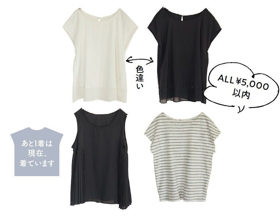 服は量があっても、手に取る物は決まっていると発見。「首回りがあいている形が好きなので、黒、白、ベージュなど、1色ずつだけ持つことに。被服代は減ったけど、以前よりも満足しています!」。