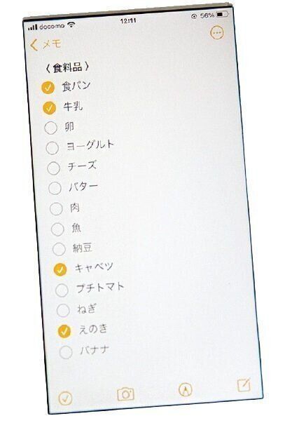 iPhoneのメモ画面下部にあるチェックマークを押すと、「◯」が表示されチェックリストに!「必ず買う物はリストにしています」。