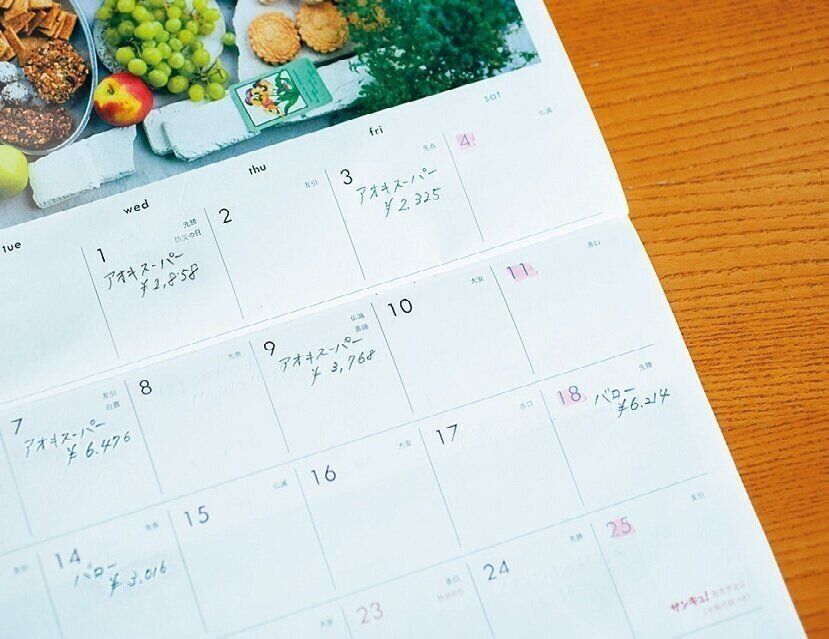 以前は、細かく家計簿をつけていたけど、大切なのは「何を買ったかではなく、あといくら使えるか」だと気づき、今日使った金額をカレンダーに書くように。「次回、外出前にチェックすれば、予算内で買い物できます」。